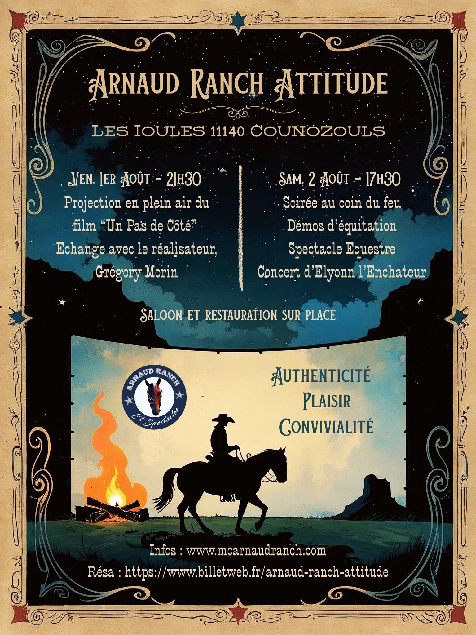 ARNAUD RANCH ATTITUDE Vendredi 1er août : projection en plein air du film 'Un Pas de Côté"  - échange avec le réalisateur Grégory Morin Samedi 2 août : soiré au coin du feu - Démos d'équitation - Spectacle équestre - Concert d'Elyonn l'Enchanteur Saloon et restauration sur place